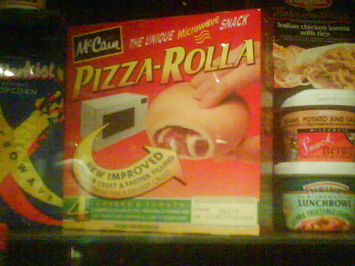 McCain PIZZA-ROLLA - they were essentially an 'inside-out' pizza with the topping of the pizza becoming the filling contained inside a bun-like outer base. Microwave for 3 minutes & enjoy. They were delicious, I have no idea why they were taken off of the market so I need YOUR help to get them back on the market!....
